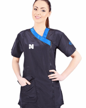 The Rimini tunic has a stylish black off-centre zip and front pocket with short sleeves with the Groom Professional logo on the back.