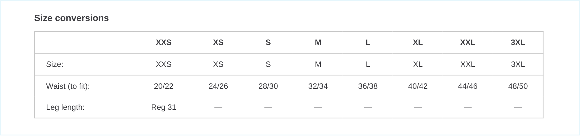 | size | 2X-Small, X-Small, Small, Medium, Large, X-Large, 2X-Large, 3X-Large |