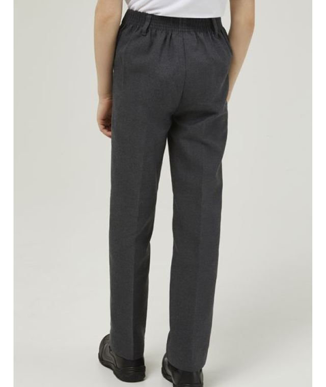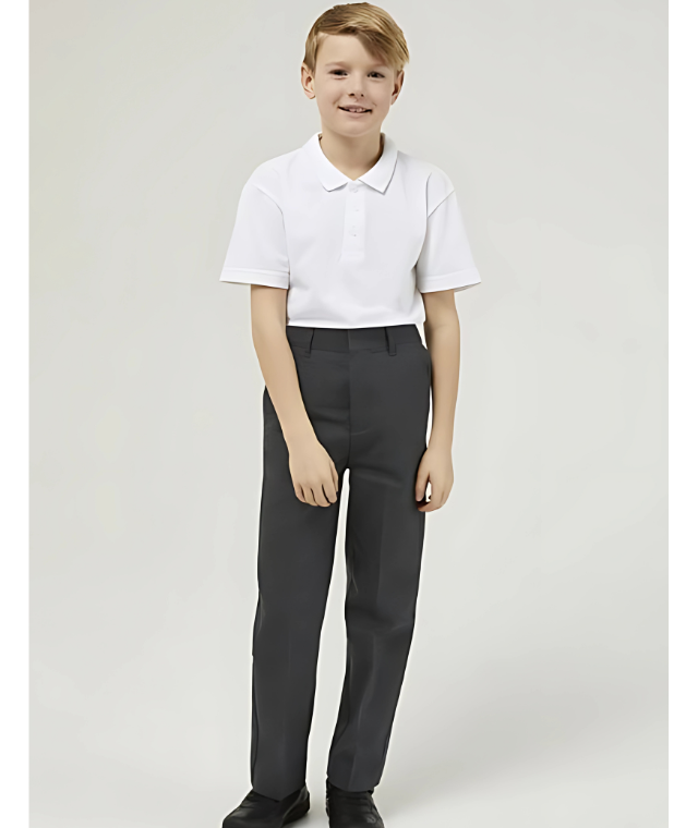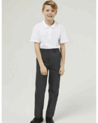 Junior boys slim fit trouser, flat front style with permanent leg crease, internal waist adjuster and stain resistant finish. Ages 4-6 are pull on with mock fly & ages 7+ have a functioning zip fly. Supplied with hanger.