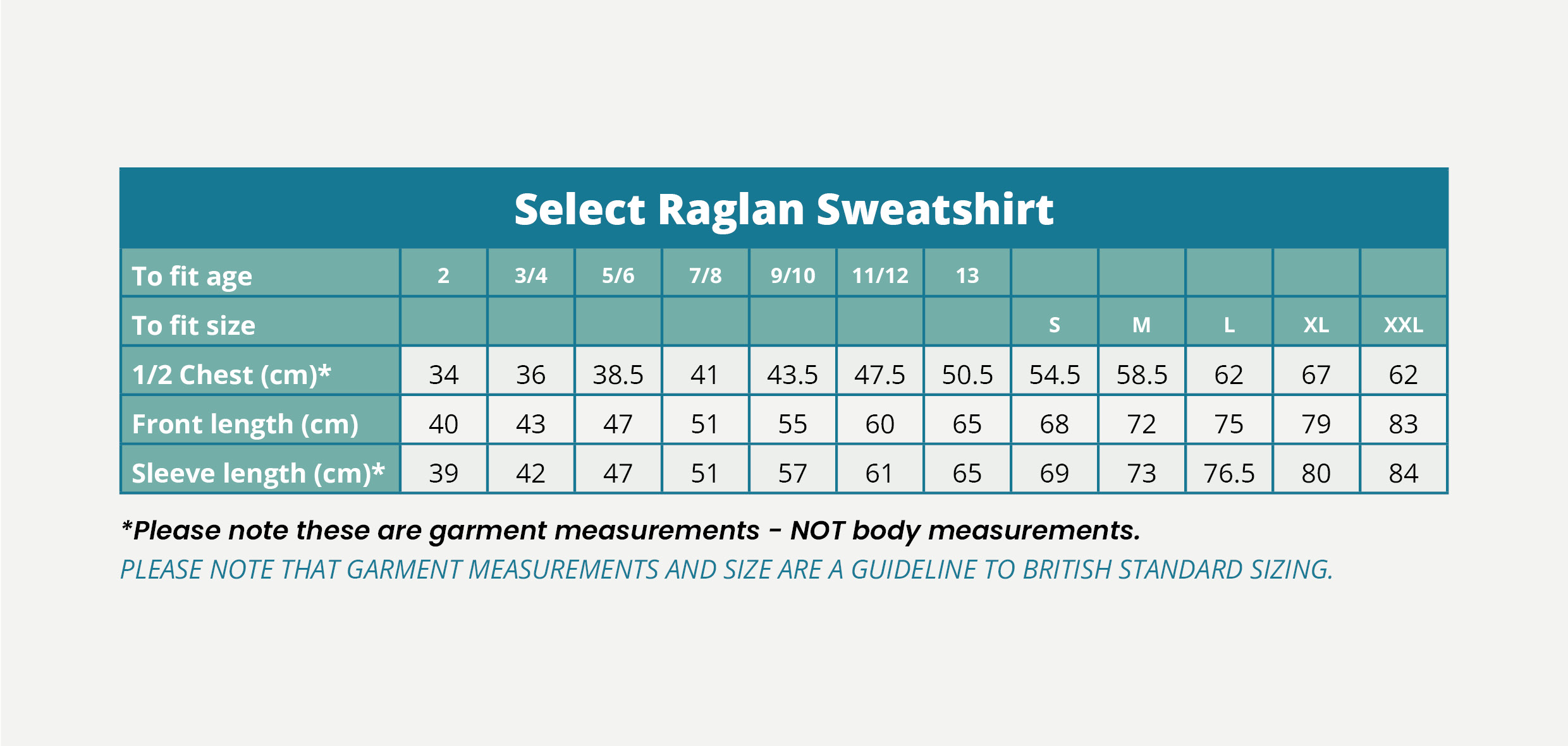 Our Raglans are made from 65% Cotton and 35% Polyester, featuring a crew neck and ribbed welt and cuffs
